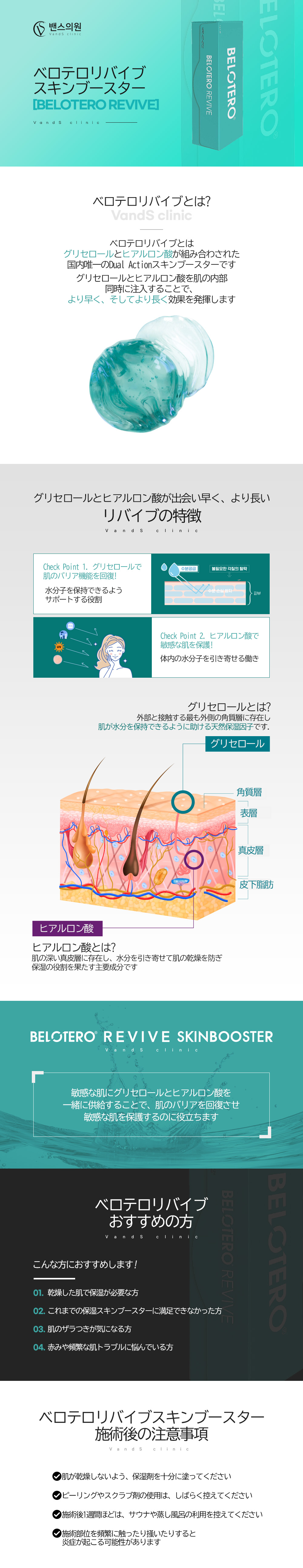 ベロテロ·リバイブ·スキンブースターは、皮膚真皮層に注入する医療機器で、マルツ固有の動的架橋技術(DCLT)を適用した多密度マトリックス(CPM)ヒアルロン酸(20mg/mL)が皮膚組織に均一に密着して自然な施術効果を示し、天然保湿因子であるグリセロールはヒアルロン酸が引き寄せた水分子を維持できるように補助する役割をします。
